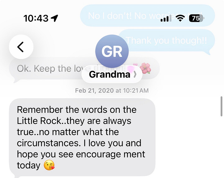 During a particularly difficult time in her divorce, an older churchwoman counseled her to write something grounding on a smooth rock: the Lord has blessed me this far. She carried it with her for decades as an anchor between homes and tragedies, before sending it off with me during a rather depressing senior year of college. In what I’d describe as the hardest week of my life to date, she serendipitously sent me this text: